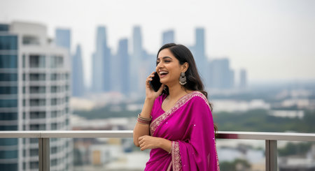 Smiling young asian female in pink sari talking on smartphone with cityscape in background