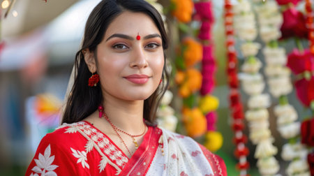 A stunning woman wearing traditional attire stands in front of vibrant decorations, embodying joy and cultural heritage during a festive celebration outdoors.