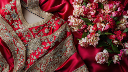 A stunning traditional garment in rich red fabric showcases intricate golden embroidery, perfectly complemented by a burst of vibrant floral arrangements for an exquisite visual appeal.
