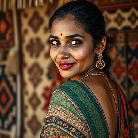 A young woman wearing a colorful sari with gold earrings and a smile on her face. Concept of happiness and positivity