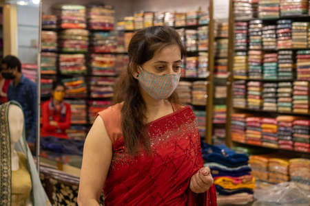 Dehradun, Uttarakhand/India-October 14 2020:A Beautiful Indian lady in saree wearing face mask for Shopping in India, Mask is mandatory due to corona pandemic. High quality photo
