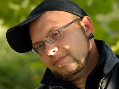 Face of young beautiful man in glasses in the green outdoors.