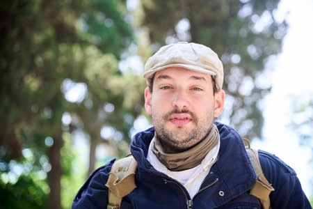 Portrait of a young man with a beard and cap, exuding confidence and style against a gray backdrop. Ideal for use in fashion, lifestyle, and personal branding projects.