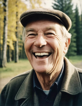 A joyful man in classic vintage clothing beams with a warm smile, enjoying the beauty of nature around him. The scene captures a carefree spirit in a tranquil outdoor setting.