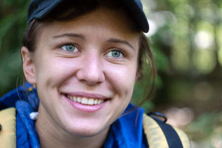 Portrait of young beautiful smiling woman without makeup in the forest. Natural beauty. Copy space. Mental health concept