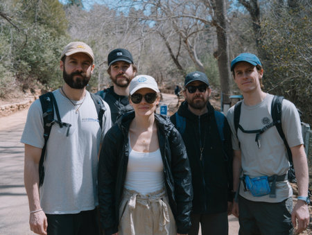 Hiking group in forest with backpacks and caps. Sunny outdoor adventure with green trees and dirt path.