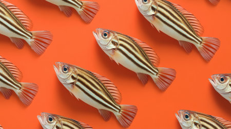 This vibrant image features a collection of fresh striped fish arranged neatly on a bright orange background. The clean and colorful presentation highlights the natural beauty and freshness of the seafood, perfect for culinary and nature-themed projects.