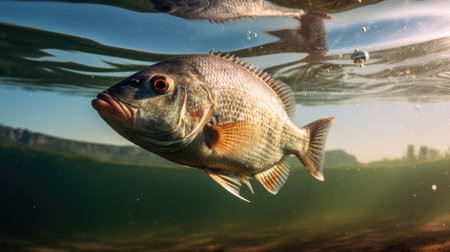 A fish gracefully swims through the clear water, displaying its vibrant scales and fins. The water ripples around it as it propels itself forward with powerful tail movements.