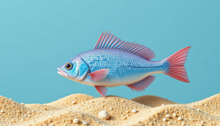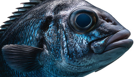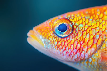 Detailed close-up of a sea fish with an intricate scale pattern, set against a serene blue ocean backdrop
