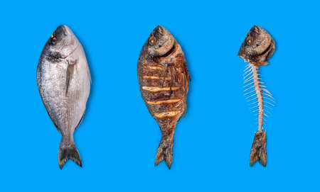 Dorado fish raw, cooked and only bones top view isolated on a blue background. Collage with a dorado fish, from raw to cooked and eaten.