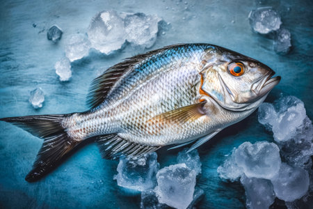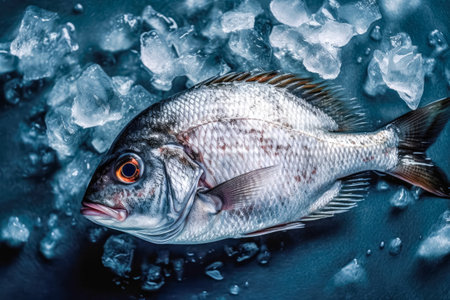 top down view of raw sea bream fish dorado in ice. Health food. space for text. generative AI.