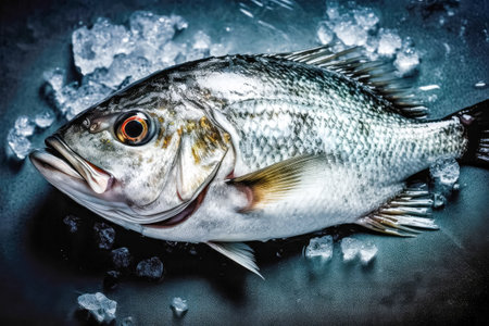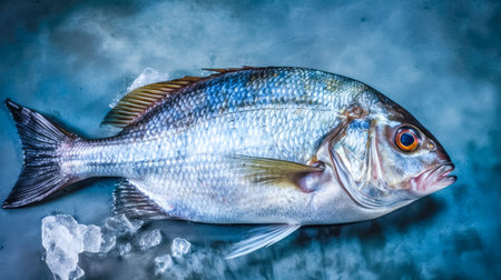 top down view of raw sea bream fish dorado on ice. Health food. space for text. generative AI.