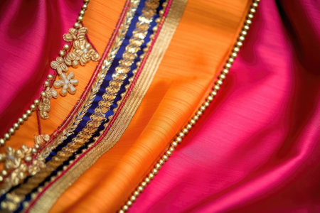 This captivating close-up displays a vibrant traditional Indian fabric showcasing intricate embroidery and rich colors, perfect for cultural celebrations.