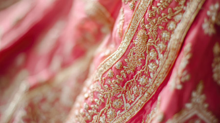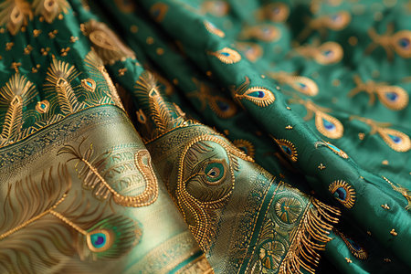 The luxurious textures of vibrant textiles are adorned with intricate embroidery, reflecting traditional craftsmanship.