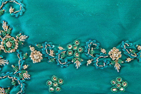 Traditional Indian saree fabric draped gracefully with embroidery details, leaving space for text.