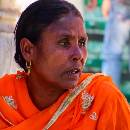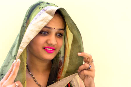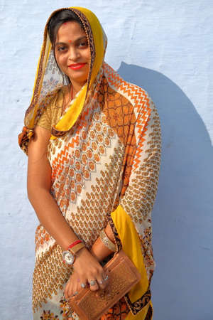 CHITTORGARH, RAJASTHAN, INDIA - DECEMBER 14, 2017: Portrait of a beautiful young woman with a colorful sari