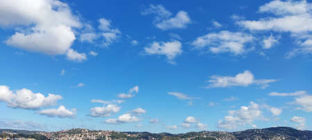 Blue sky background with white clouds, rain clouds on sunny summer or spring day.