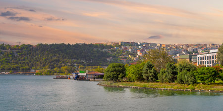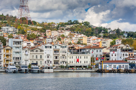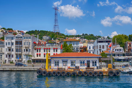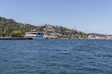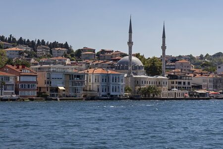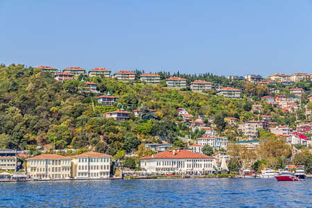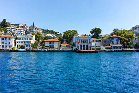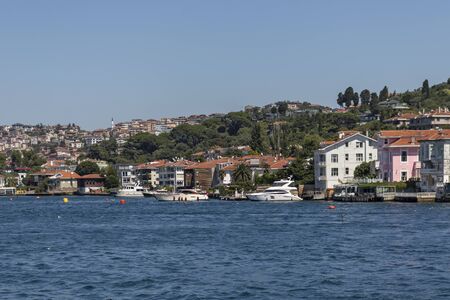 View of buildings by Bosphorus in Rumeli Hisari neighborhood on European side in Istanbul. It is a sunny summer day. Beautiful travel scene.