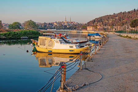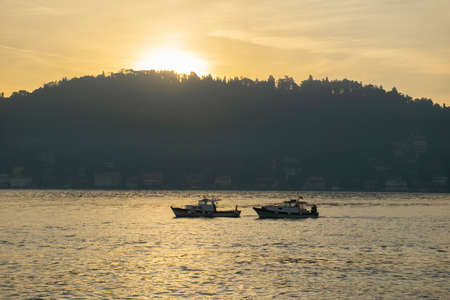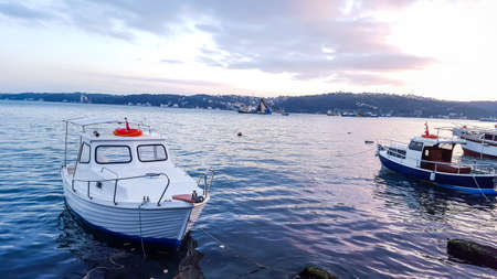 View of a small, wooden fishing boat on Bosphorus and the Asian side of Istanbul. Sunset light effect is applied.