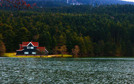 Bolu Golcuk Lake and famouse house view with reflections. Travel to Turkey background photo. Bolu Turkey or Turkey - 5.15.2022
