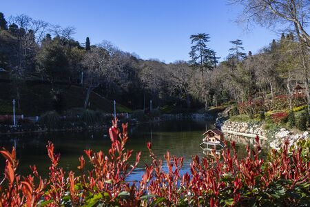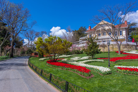 Emirgan Park and pond with Sari Kosk. emirgan grove in Turkish. Travel to Istanbul background photo. Istanbul Turkey - 4.16.2022