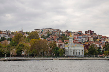 ISTANBUL, TURKEY - SEPTEMBER 29, 2013 View of the Besiktas Iskelesi and residental buildings sailing Bosporus.