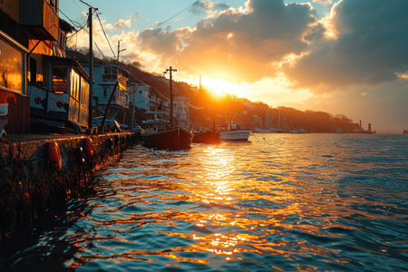 The Golden Horn glimmers at sunset, surrounded by vibrant greenery and the bustling urban life of Beyoglu District in Istanbul, Turkey, reflecting the citys rich history and natural beauty