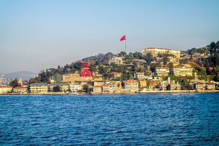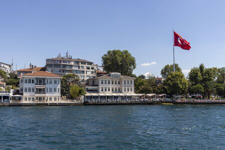 View of Bosphorus ,coast and sea bay from the ferry with Turkish flag in the wind, Beykoz in Istanbul, Turkey