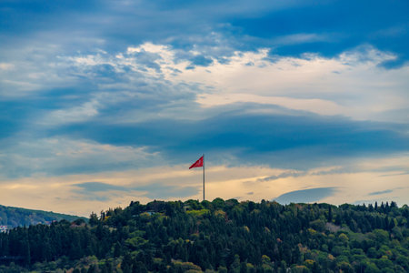 ISTANBUL, TURKEY - MAY 4, 2019: View of the Istanbul Bosphorus from Otagtepe. Fatih Sultan Mehmet Bridge with Turkish Flag. Istanbul Turkey.