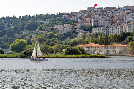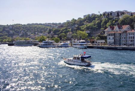 View of a yacht and fishing boat passing on Bosphorus and Baltalimani neighborhood on European side of Istanbul. It is a sunny summer day. Beautiful travel scene.