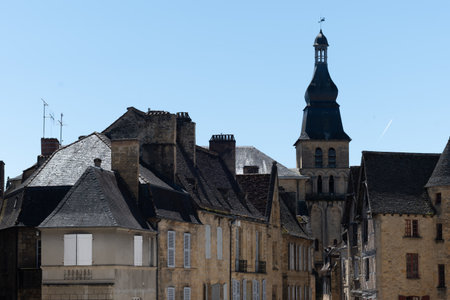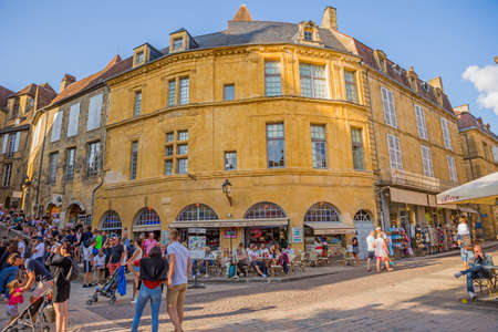 Sarlat-la-Caneda, France - August 11, 2019: Houses of the centre of the old medieval town of Sarlat-la-Caneda, Dordogne, France.