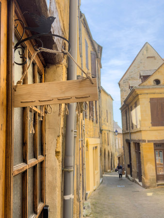 Sarlat in Aquitaine, France. The capital of Périgord Noir, a medieval village full of picturesque alleys and monuments. View of a typical alley in the historic center.