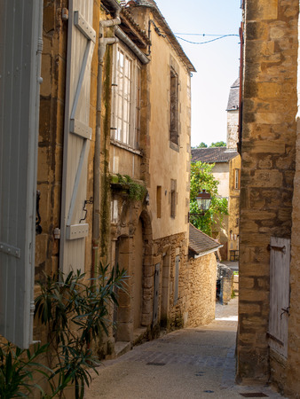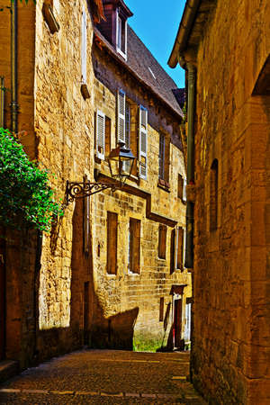 Typical narrow street in the medieval Old Town of Sarlat la Caneda, Perigord, France