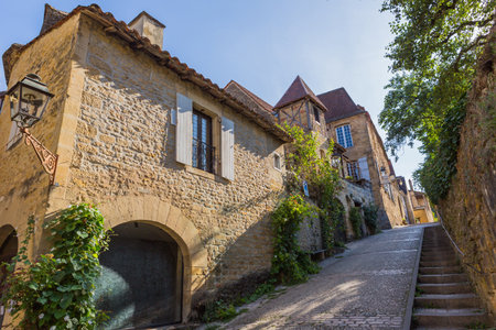 Sarlat la Caneda, France - July 2, 2020: Picturesque street in the medieval old town of Sarlat la Caneda, Périgord, Dordogne, France
