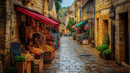 Winding narrow streets of Sarlat-la-Canéda showcase medieval architecture, vibrant market stalls, and beautiful countryside, embodying the historic charm of Nouvelle-Aquitaine.