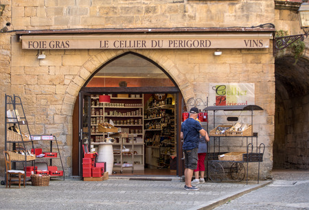 Sarlat, France - September 2, 2018: Attractive display in window of wine and Foie Gras shop in Sarlat la Caneda in Dordogne Department, Aquitaine, France. Sarlat is the capital of foie gras and fine dining