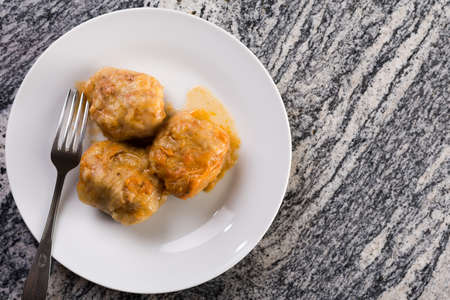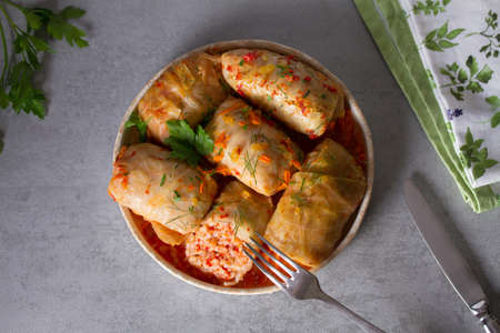 Flat lay above served cabbage stuffed with minced on the grey granite bacground table.