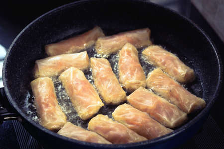 Making cabbage rolls, female hands twist the cabbage leaves and make sarma