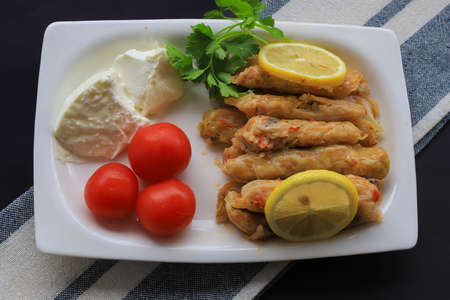 Delicious stuffed grape leaves rice, white yogurt sauce. Lebanese stuffed wrap on plate. Lebanon turkish greek middle eastern cuisine. (Turkish name; Leaf wrapping)