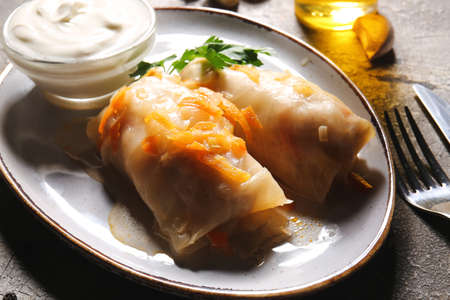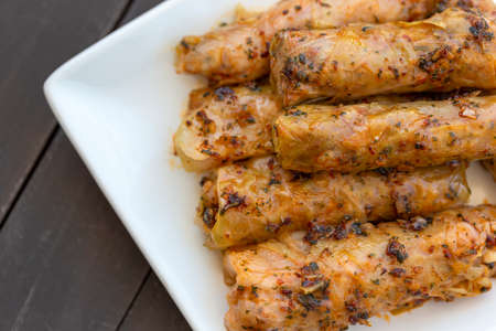 Stuffed cabbage leaves, in a ceramic plate. Vegan cabbage rolls, cooked cabbage leaves, wrapped around a filling of rice, onions and spices. (Cabbage wrap) Horizontal view. close up