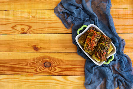Traditional georgian dolma in grape leaves on rustic wooden table with copyspace