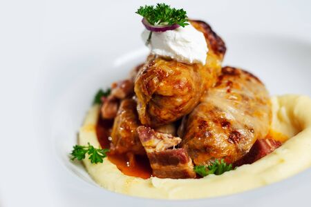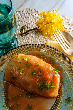 Polish cuisine stuffed cabbage roll garnished with fresh dill