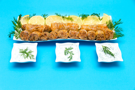 Dolma cabbage rolls grape leaves with filling, white sauce, lemon and herbs, rustic, selective focus, no people,