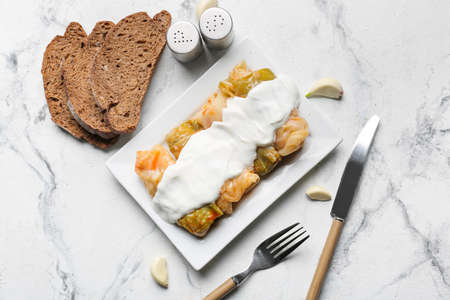 Stuffed cabbage rolls with sauce over white stone background. Top view, flat lay