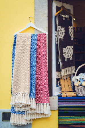 many traditional portuguese wool scarves and cotton cloth with different colors hanging from a window