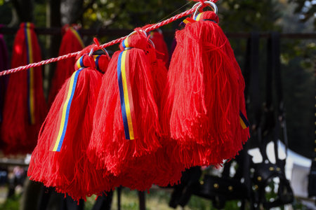 Horse red decoration. Closeup of flamboyant saddlery. Red fringes for sale