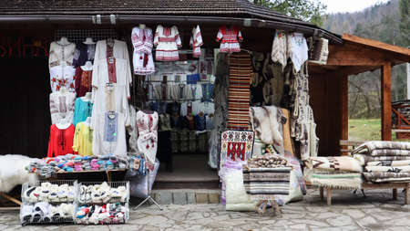 Souvenir market in Yaremche with traditional Carpathian handmade clothing, herbs and wooden tools. Ukrainian textiles, knitted socks, vests, hats. Ukraine, Yaremche - November 20, 2019.