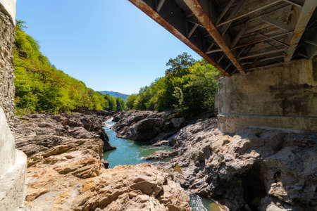 Metal bridge over a river in the mountains view from under the bridge.