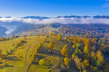 Aerial view of autumn hill and forest with cloud floating over the lake in Romanian Carpathians
