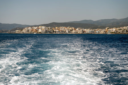 Waves gently ripple as a boat glides by the coastal town of Agios Nikolaos in Crete.